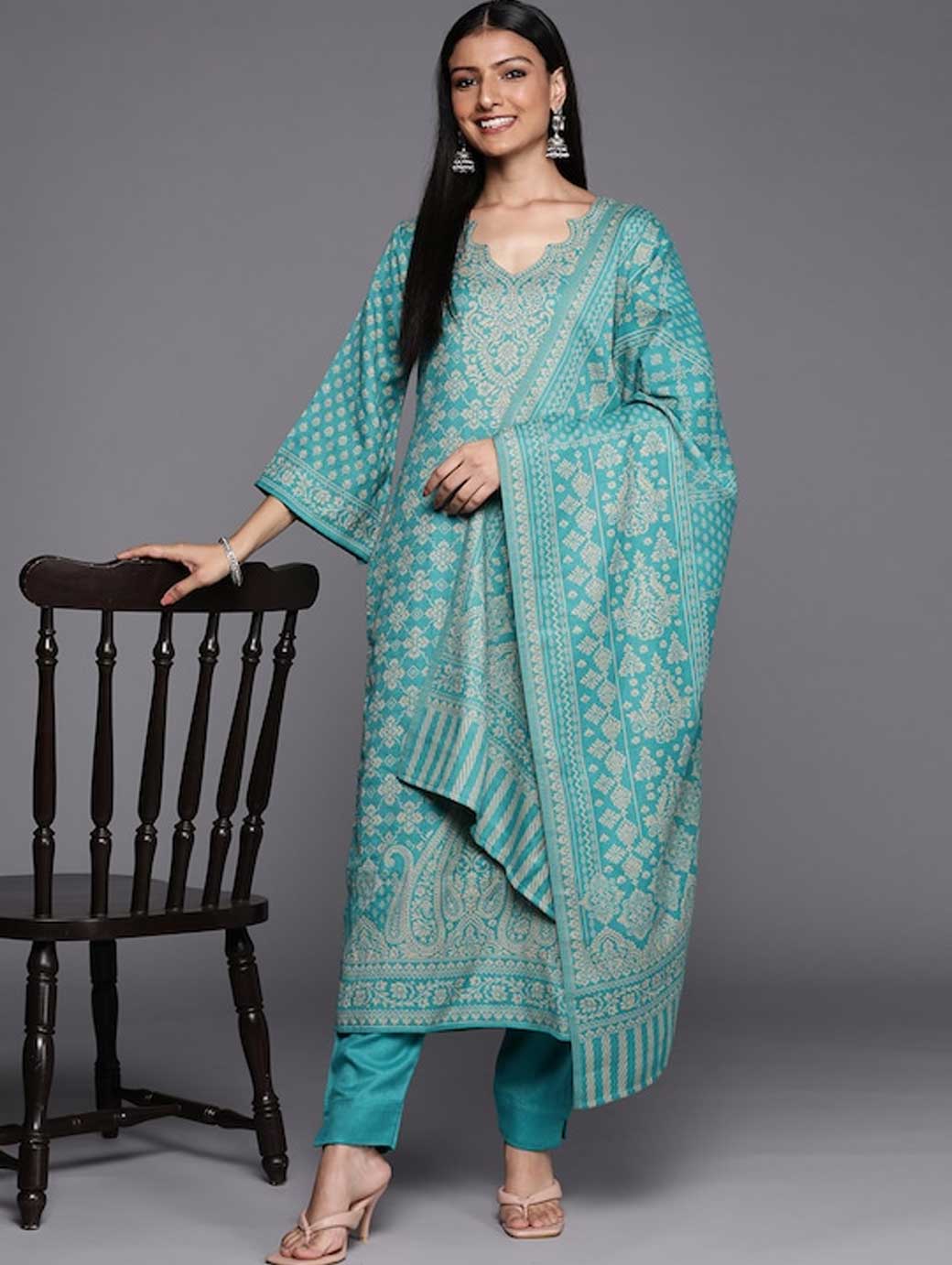 Green and beige woven design unstitched dress material