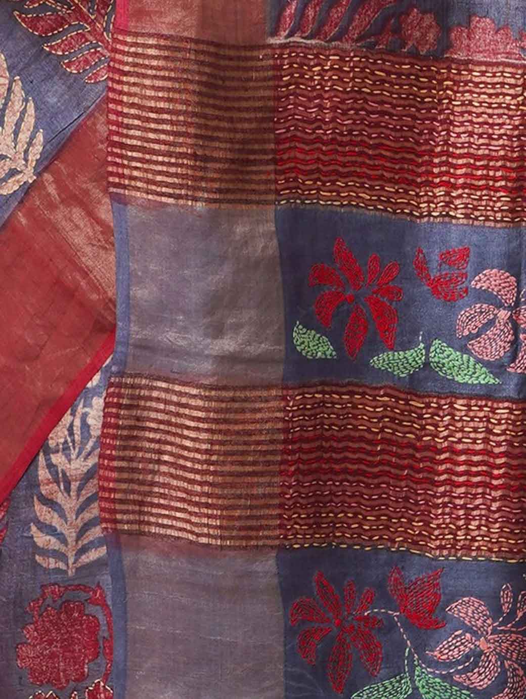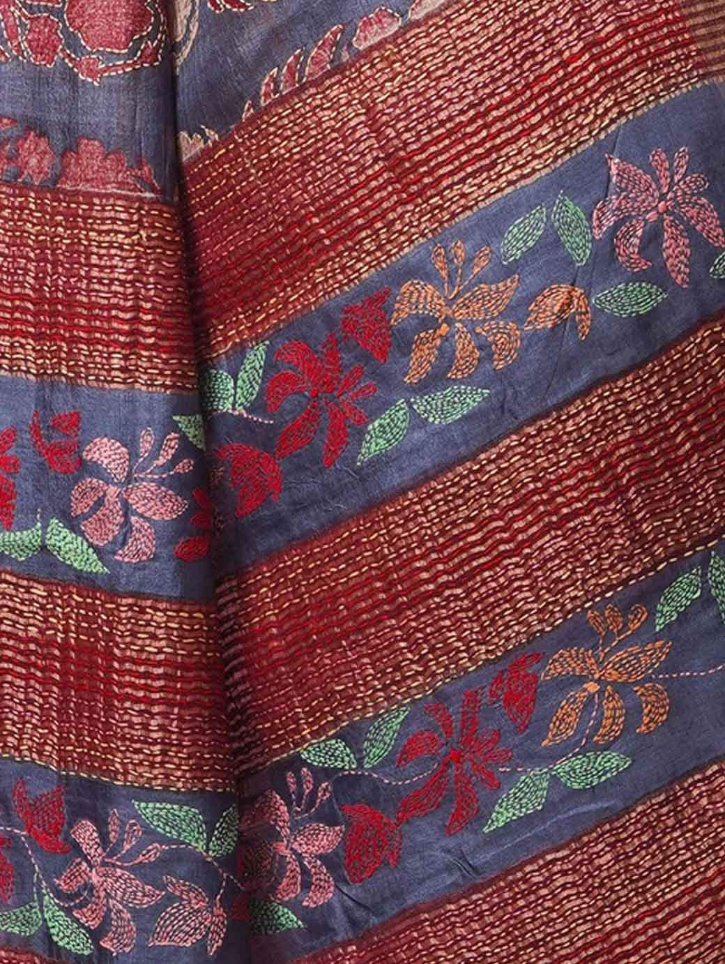 Maroon & Blue Woven Design Kantha Work Pure Silk Tussar Saree