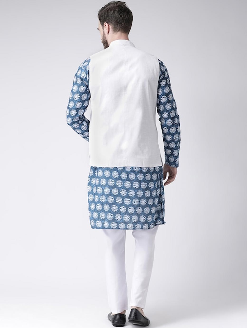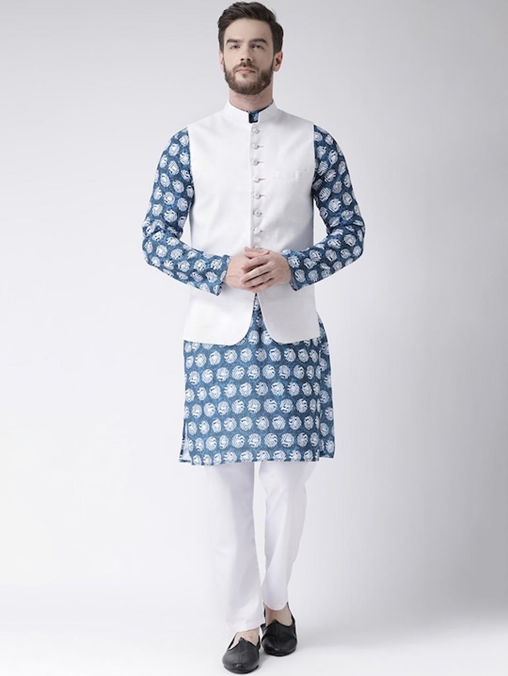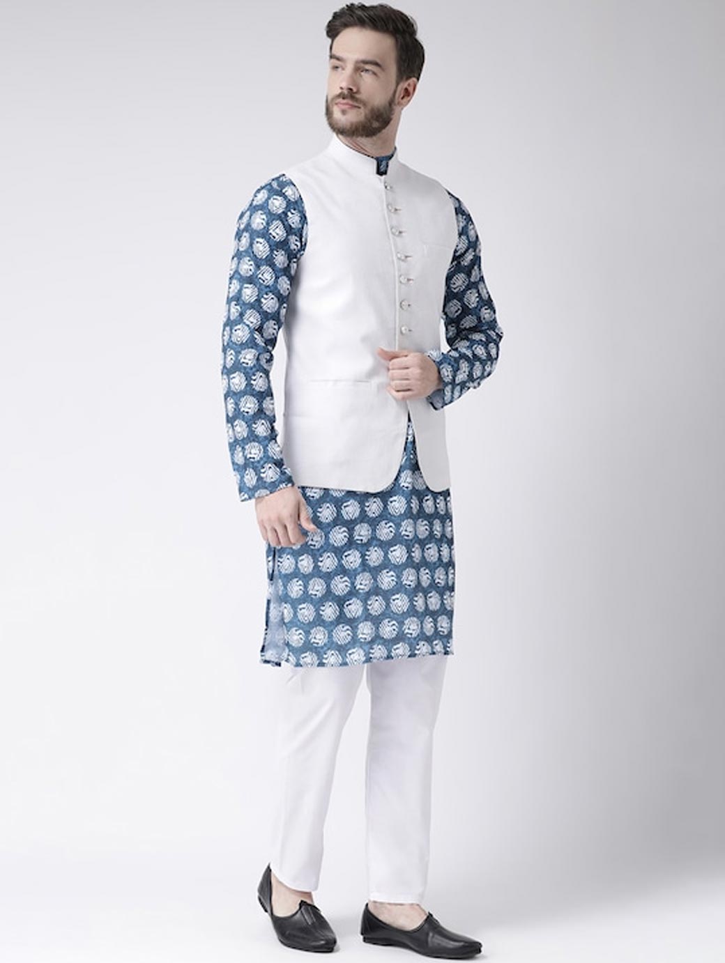Men White Floral Printed Kurta with Churidar