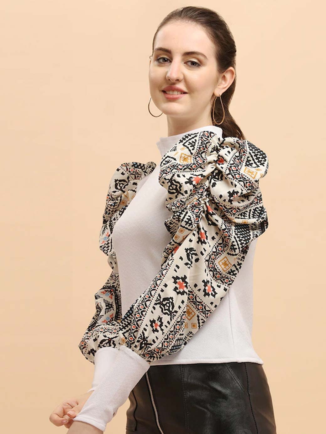 White Ethnic Motifs Printed Puff Sleeve Top