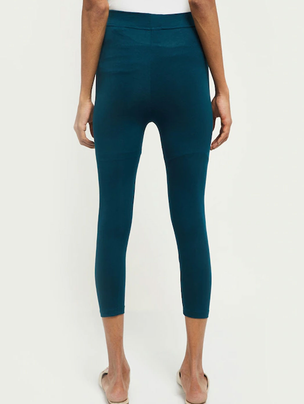 Teal blue solid three-fourth length leggings, has an elasticated waistband with slip-on closure